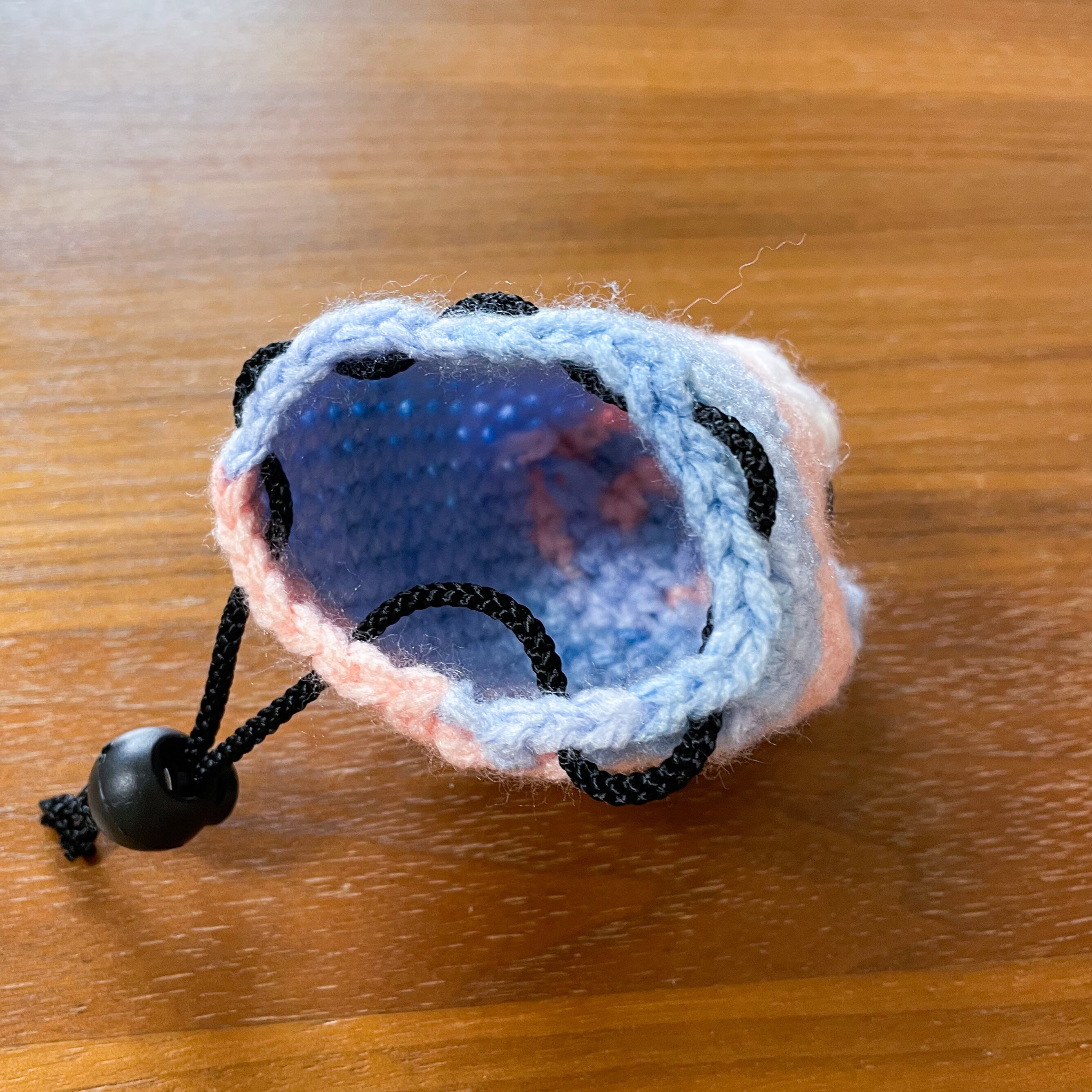 アクリル毛糸で編んでおり、閉じ口にはワンタッチで開閉できるコードストッパーを使っています。