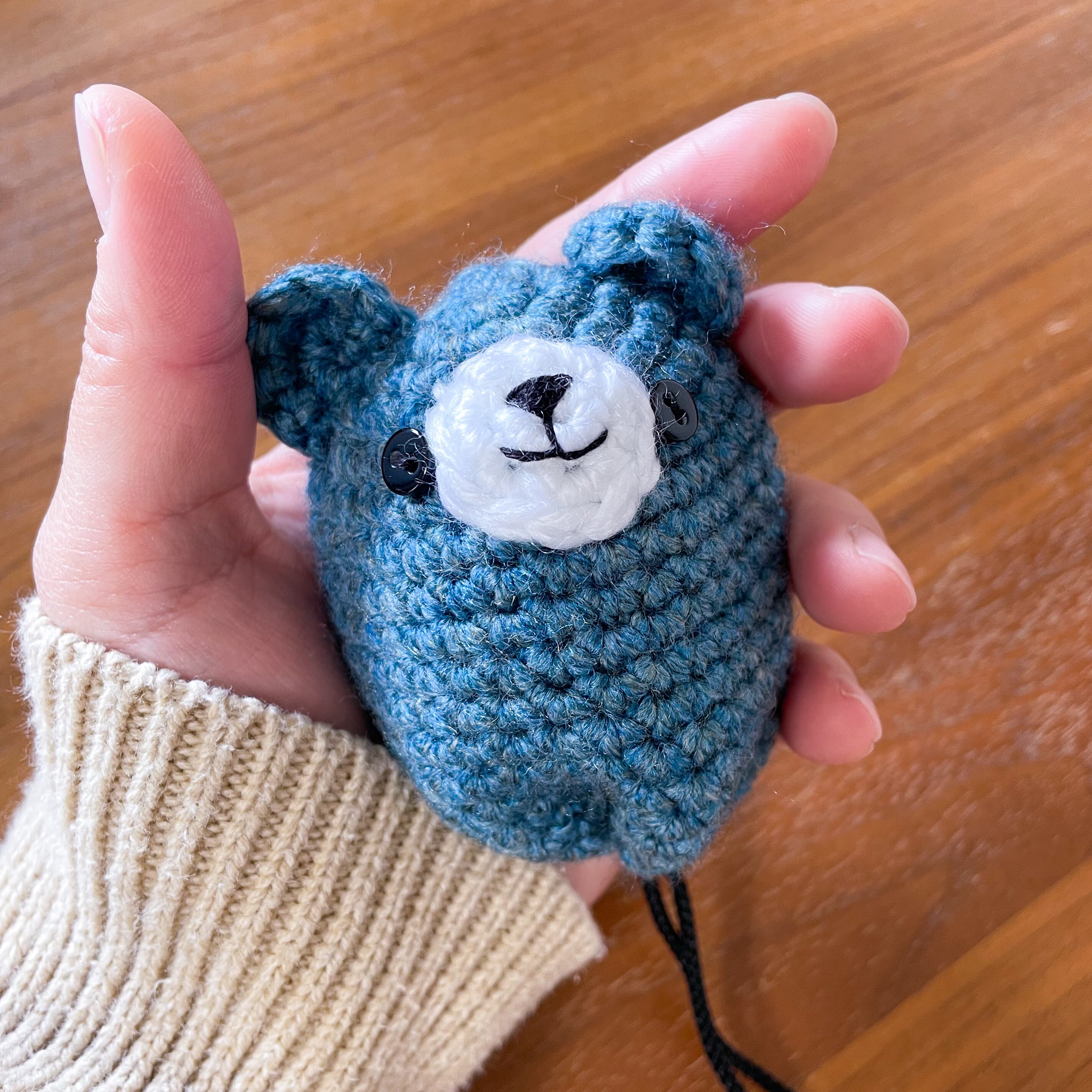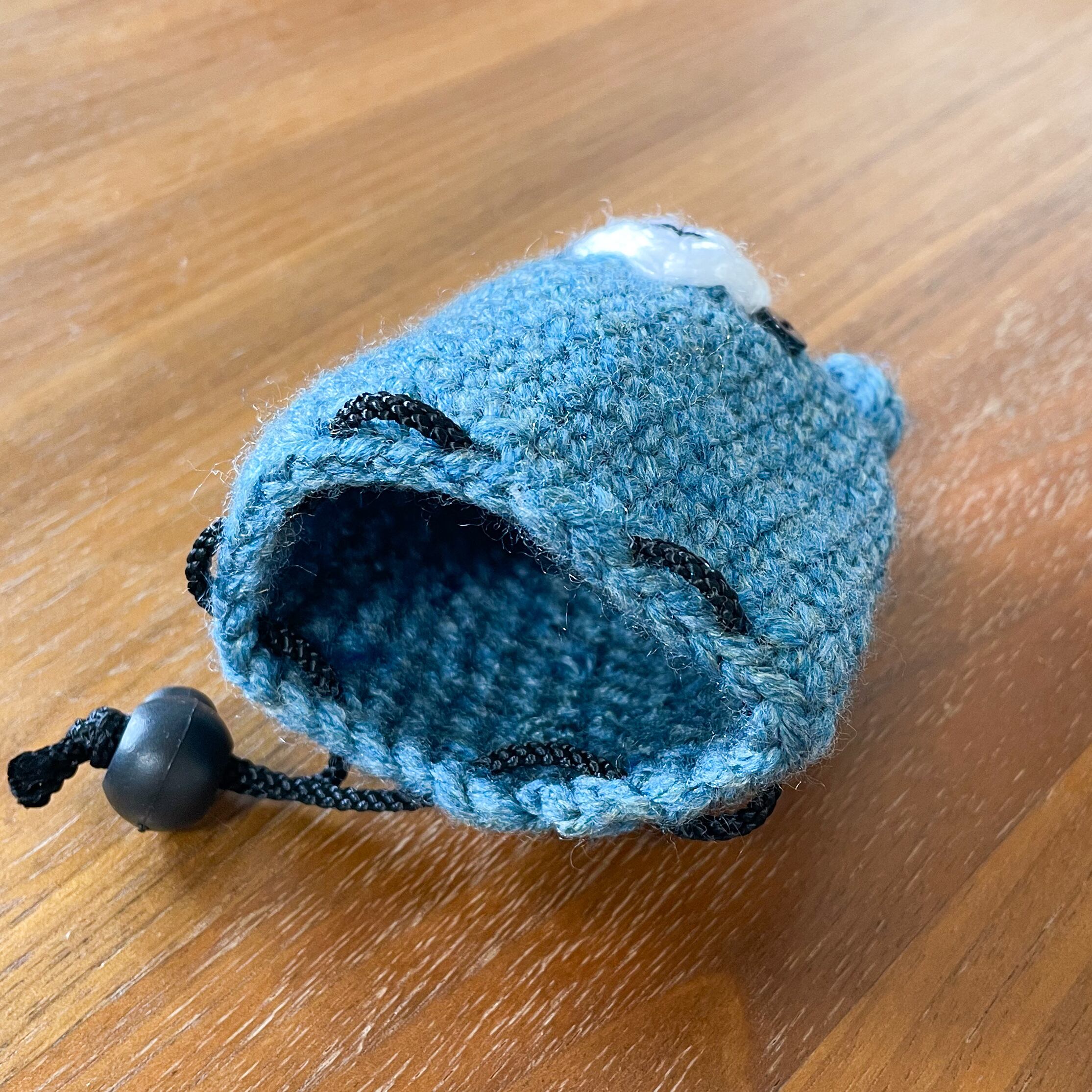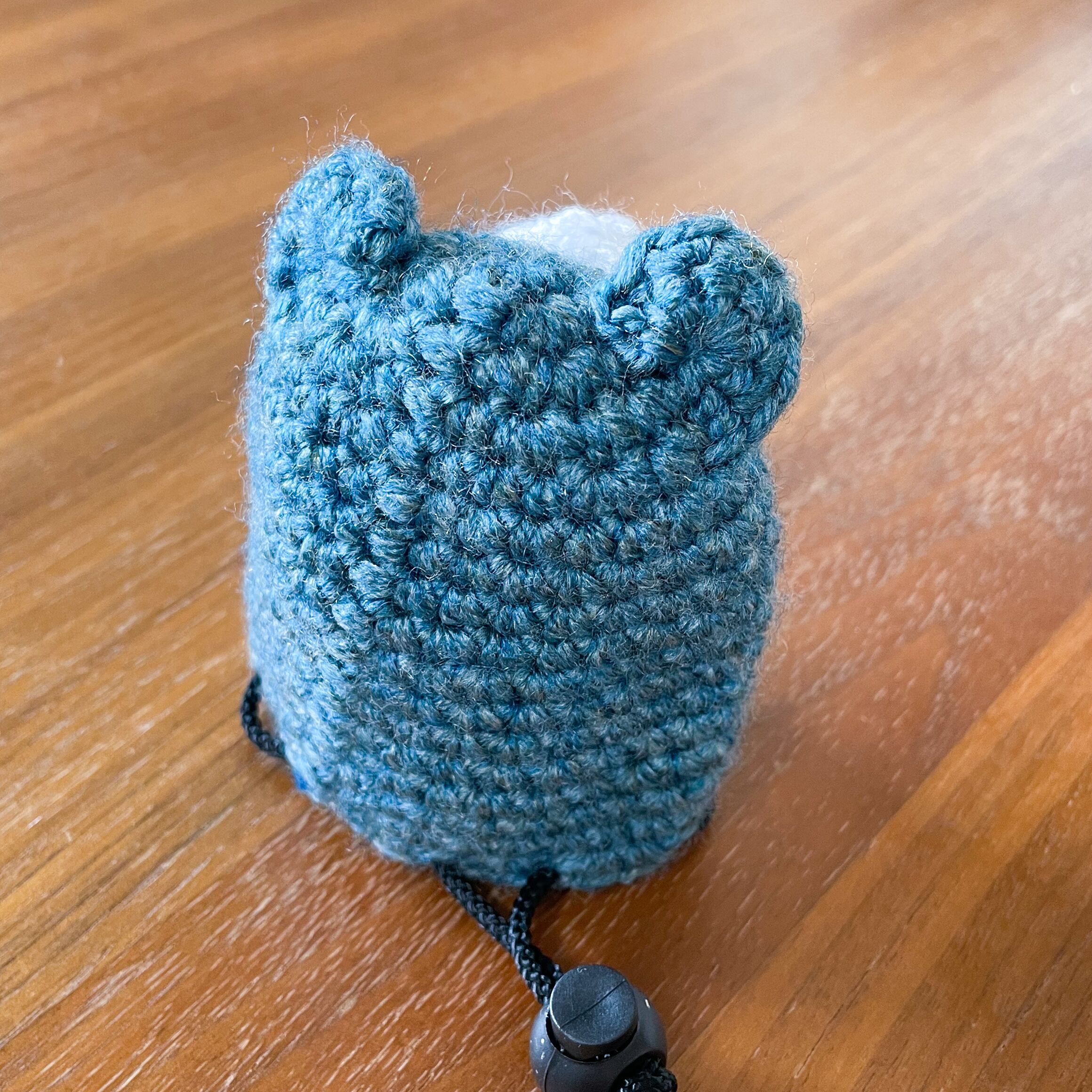 アクリル毛糸で編んでおり、閉じ口にはワンタッチで開閉できるコードストッパーを使っています。