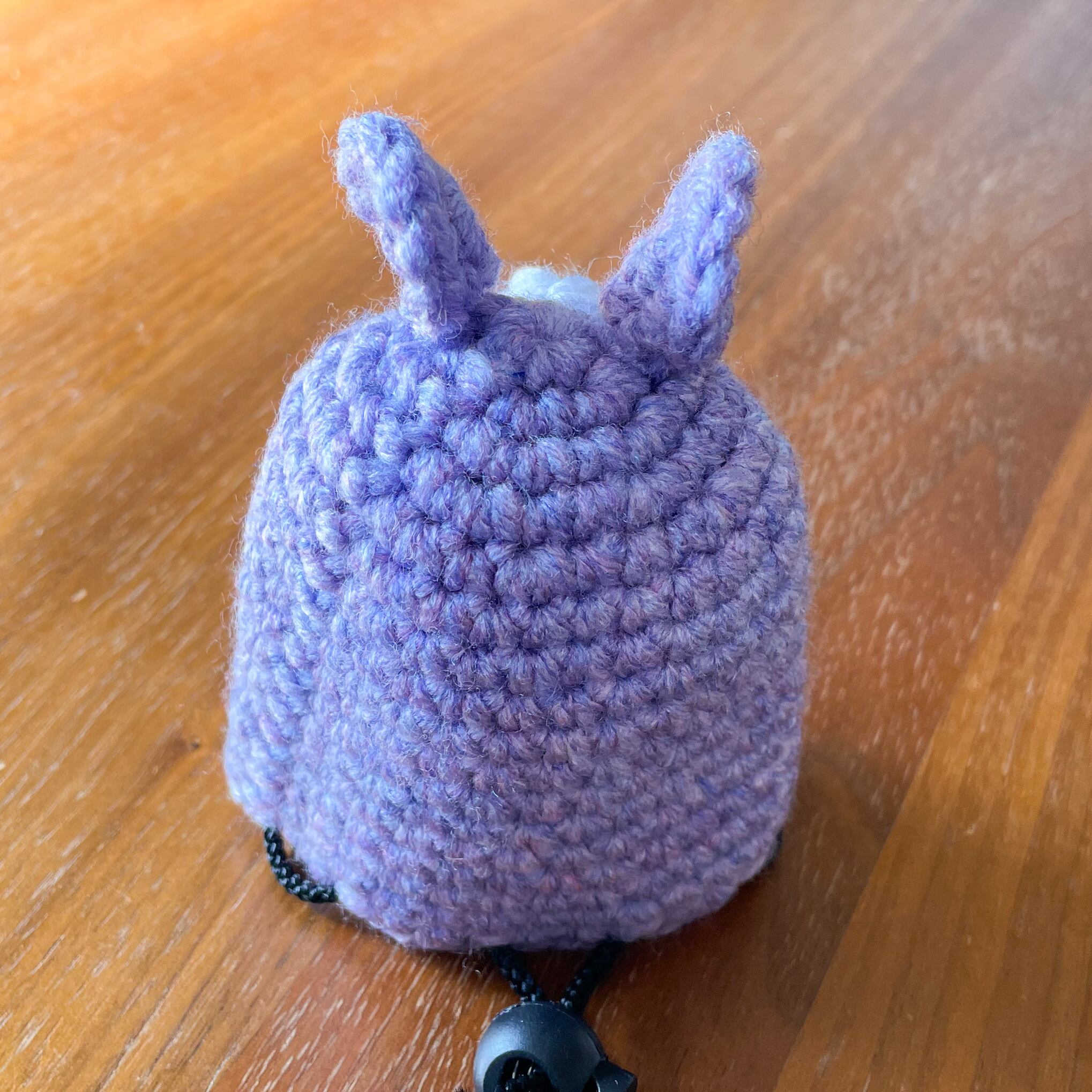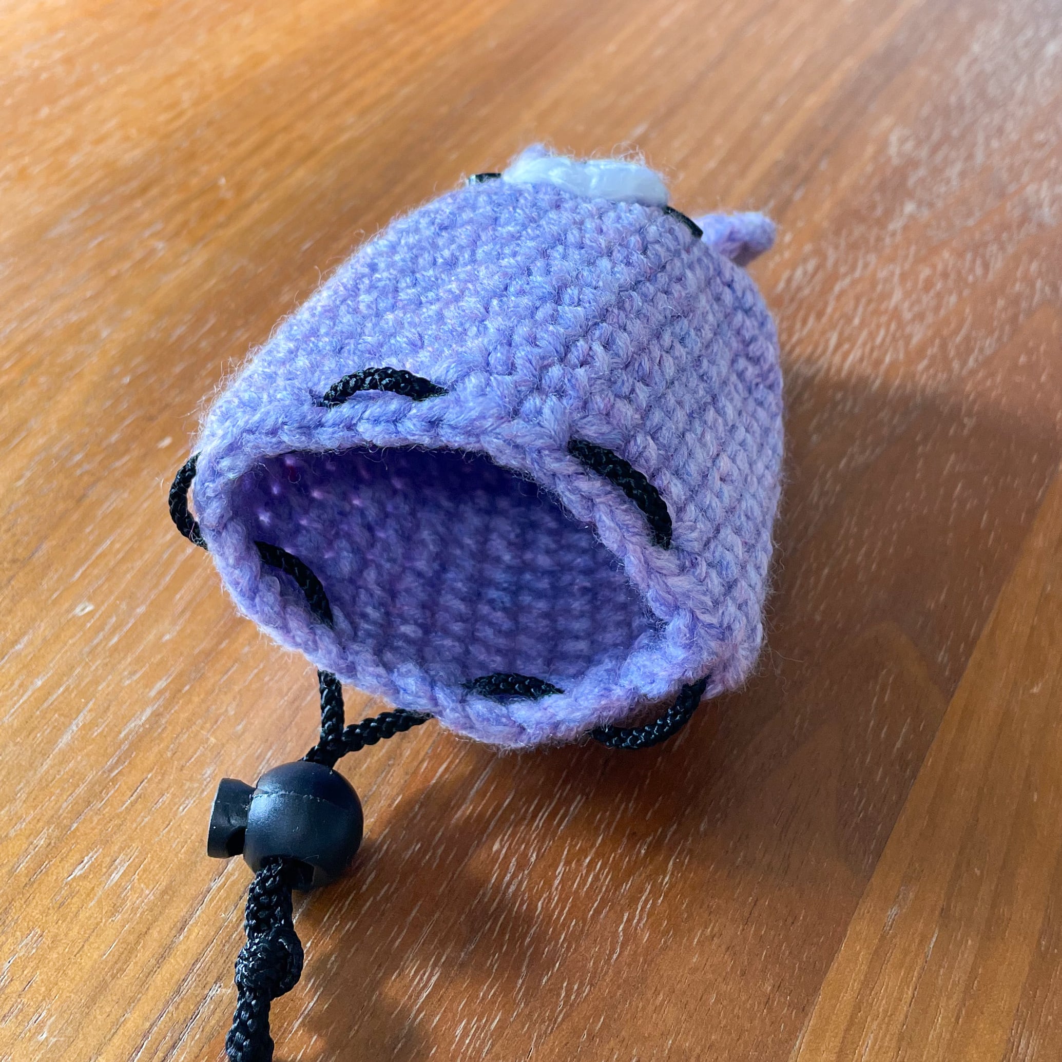 アクリル毛糸で編んでおり、閉じ口にはワンタッチで開閉できるコードストッパーを使っています。